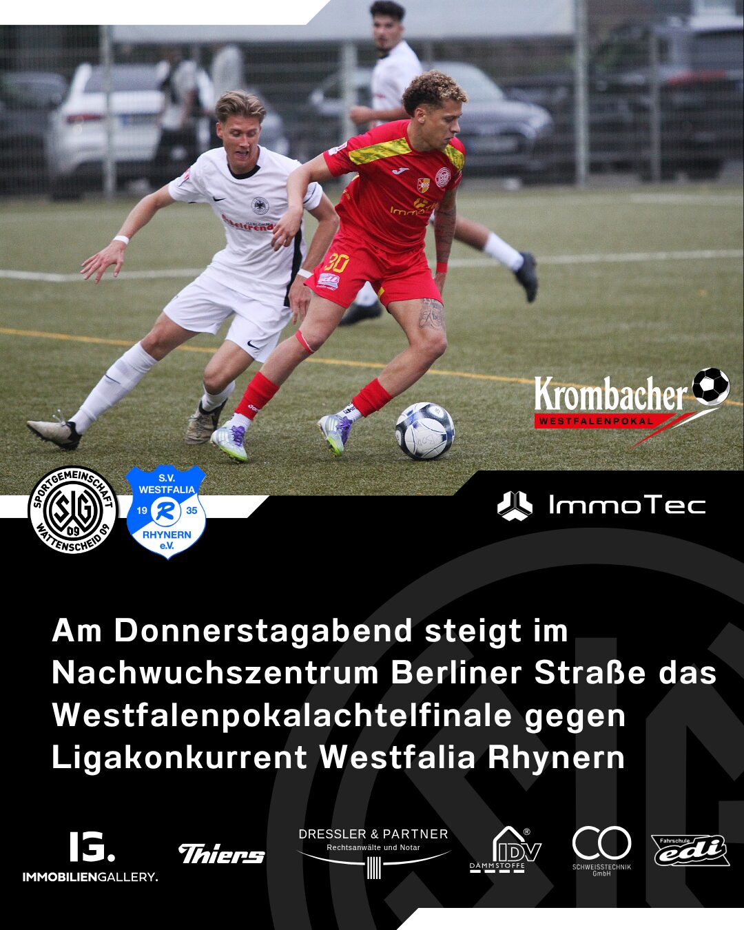 Für die SG Wattenscheid 09 steht nach dem Sprung an die Tabellenspitze der Oberliga Westfalen die nächste Aufgabe im Westfalenpokal auf dem Programm. Nach souveränen Siegen bei den Landesligisten TuS Eichlinghofen (3:0) und Borussia Dröschede (9:1) treffen die Schützlinge von Cheftrainer Christopher Pache im Achtelfinale auf den Ligakonkurrent Westfalia Rhynern. Die Partie gegen den aktuell Tabellenvierten der Oberliga Westfalen wird am Donnerstagabend um 19:30 Uhr im