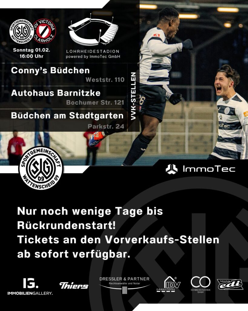 Das Heimspiel der SG Wattenscheid 09 am 21. Spieltag der Oberliga Westfalen gegen die U21 vom SC Preußen Münster wurde vorverlegt. Die Partie wird nun am Freitagabend, 6, Februar 2026 um 18.30 Uhr im Lohrheidestadion – powered by ImmoTec – angepfiffen!