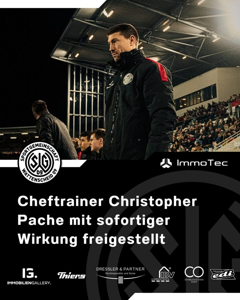 Die SG Wattenscheid 09 hat seinen Cheftrainer Christopher Pache mit sofortiger Wirkung freigestellt. Diese Entscheidung war das Ergebnis einer „umfangreichen Analyse der sportlichen Entwicklung in den letzten Wochen“. Christopher Pache hatte das Traineramt an der Lohrheide vor der Spielzeit 2024/2025 übernommen, die die Sportgemeinschaft auf dem 8. Tabellenplatz in der Oberliga Westfalen beendete. In der […]