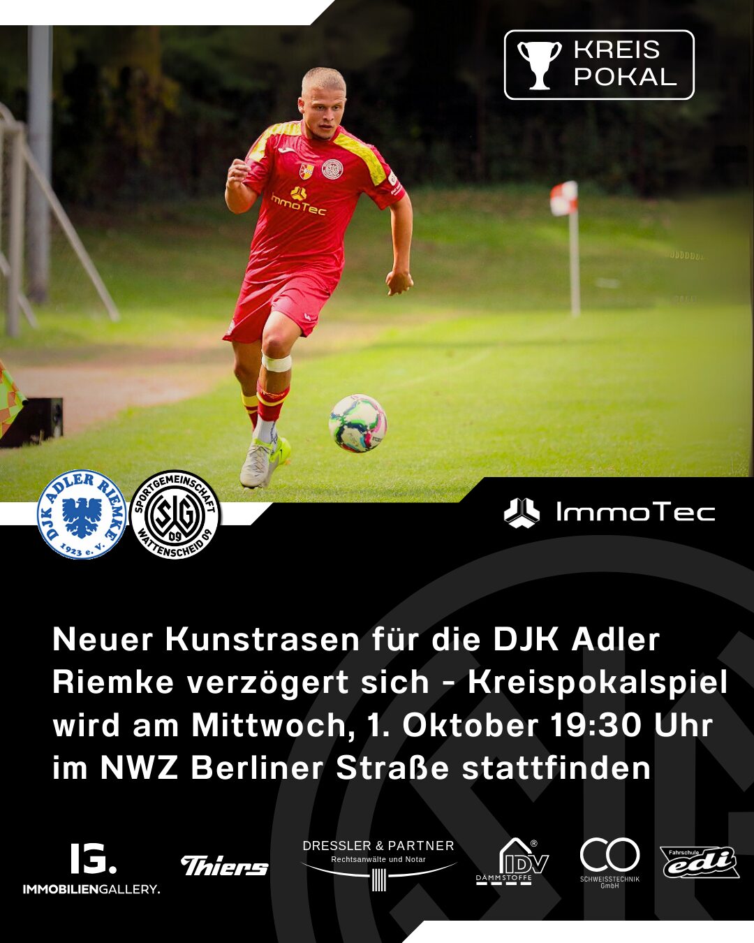 Am 1. Oktober 2025 um 19:30 Uhr findet das Zweitrundenduell im Kreispokal gegen den Kreisligisten DJK Adler Riemke statt. Da sich die Fertigstellung des neuen Kunstrasenplatzes in Riemke leider verzögert, wurde der Spielort in das Nachwuchszentrum Berliner Straße verlegt. Dementsprechend gibt es das Wiedersehen mit dem ehemaligen 09er, Basti Kleine, der aktuell Trainer der DJK Adler Riemke ist, am Mittwoch, 1. Oktober um 19:30 Uhr im